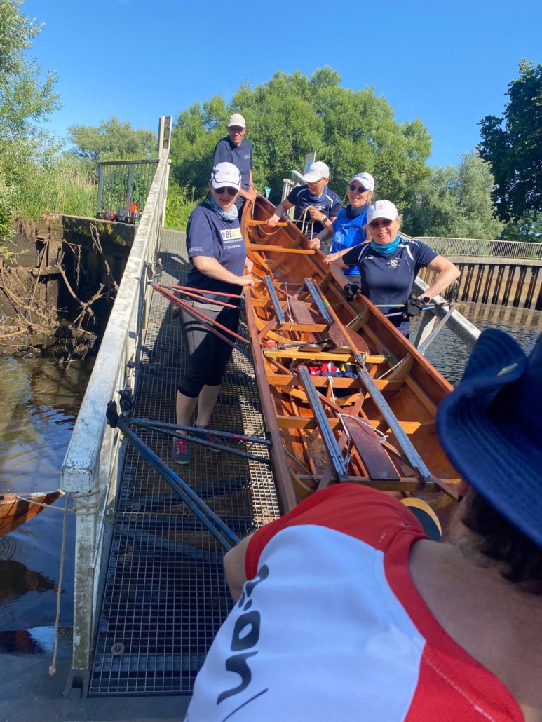 Am Donnerstag galt es auf der Hamme von Osterholz-Scharmbeck bis zur Mündung zu rudern um dann in die Wümme abzubiegen. Das war gar nicht so leicht, wenn man noch nie vor Ort war. Ein Gewässer vom Bord eines Ruderbootes zu erkunden ist doch anders als das Zoomen beim google.maps. Nachdem die Frage, wann wir links in die Wümme abbiegen müssen, beantwortet war, bemerkten wir schnell wie anstrengend es ist, gegen die Gezeiten zu fahren. Ablaufendes Wasser bedeutet, wenn man ins Landesinnere will, Gegenströmung. Irgendwann erreichten wir die Schleuse Dammsiel, die wir zügig passierten, um sofort danach anzulegen. Mittagsrast! Mit den Dingen, die wir mitgebracht hatten, gab es ein tolles Picknick. Der Streckenabschnitt (genannt Blocklandgewässer) auf der kleinen Wümme, dem Torfkanal und dem Kuhgraben hatte einen besonderen Reiz. Wir fuhren durch Kleingartensiedlungen, dann durch Wald, kamen zu einer Schleuse mit einem Hub von wenigen Zentimetern, hatten eine kurze Passage Industriegebiet, um dann auf einem Kanal unter Bäumen zu rudern. Die Schleuse am Ende des Kuhgrabens ist defekt. Die Reparatur der Anlage ist ungewiss; die beteiligten Behörden streiten sich wegen fehlendem Geld. Wir mussten daher die Boote umsetzen, um auf der Wümme weiter bis nach Lilienthal fahren zu können. Die Einfahrt in die Wörpe haben wir fast nicht gefunden. Es war ein Rinnsal, das kurz vor einer Straßenbrücke, etwas Wasser in die Wümme abgab. Rudern war hier nicht möglich, die Woipe war zu schmal und so flach, dass wir nur noch eine Handbreit Wasser unter dem Kiel hatten. Nach wenigen Metern hatten wir das Tagesziel, die dortige Kanuscheune erreicht. Mit vereinten Kräften holten wir hier die Boote aus dem Wasser.
