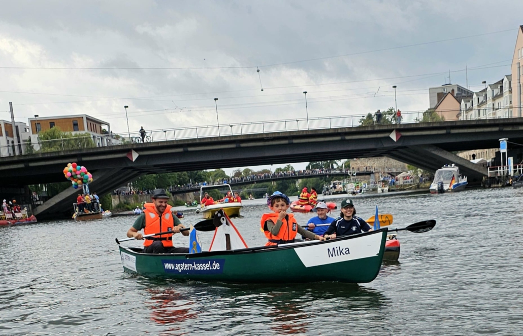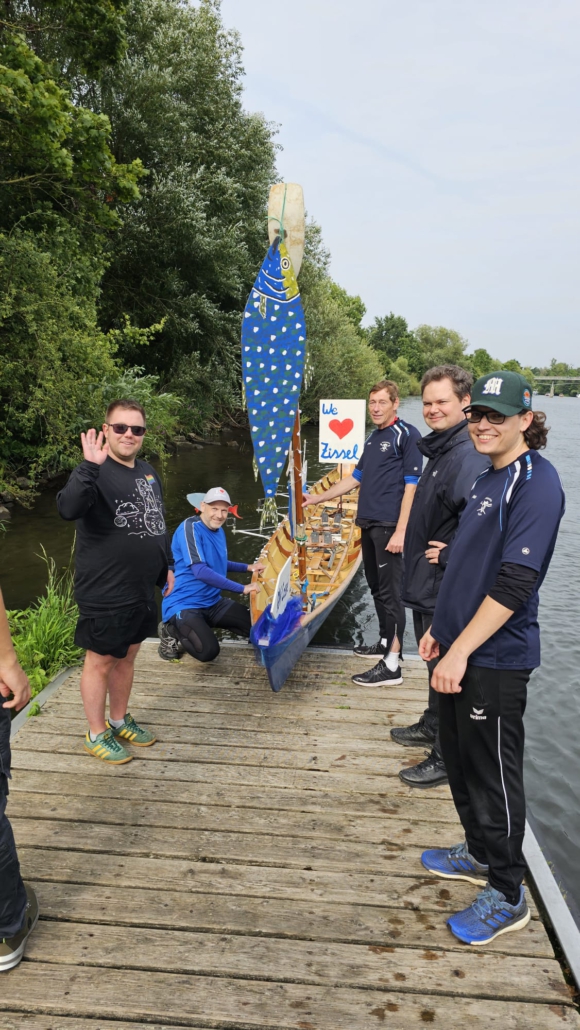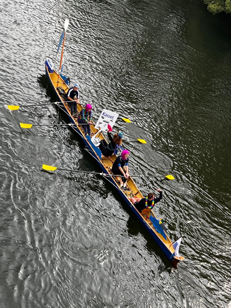 Unter dem Motto „99 moh de Häring gehisst, bim Zissel zählt der Spaß, nit wer de bist“, fand der diesjährige Zissel statt. Der RV Cassel beteiligt sich, wie in den Vorjahren auch, am Festumzug. Allerdings war 2025 einiges anders als in den letzten Jahren. Es war nur eine kleine Truppe, die an den Vorbereitungen und am Festboot helfen konnte. Daher wurde auf den Bau eines Katamarans verzichtet. Stattdessen wurde der Wanderrudervierer „Hans Werner“ zum Festboot umgebaut. Martin Heinzl übernahm die technische Leitung. Er sorgte dafür, dass die Motive stabil am Rumpf des Bootes befestigt werden konnten. Danke dafür! Danke auch an alle anderen, die mit angepackt haben. Bunt und schrill gingen die Teilnehmer des RVC an Bord. Es war eine Gaudi, auch wenn wir in diesem Jahr keinen Preis gewonnen haben. Wir haben mitgefeiert und dem Wetter getrotzt. Es war in diesem Jahr kühl und regnerisch. Der RVC war mit einem Vierer, einem Kanu und einem Kanadier beim Festzug dabei. Enno war erstmalig beim Umzug dabei. Er war so begeistert von dem Geschehen auf dem Fluss, dass er am Abend schon erste Entwürfe für das Festboot 2026 entworfen hat. Ist das nicht toll.